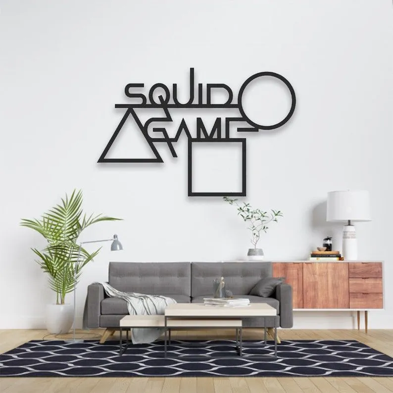 This striking wooden wall decor is inspired by the popular series Squid Game. Crafted in a modern, minimalist style, the design cleverly integrates the show’s title, “SQUID GAME”, with its iconic geometric symbols—triangle, circle, and square—used prominently throughout the series. The matte black finish adds a bold contrast against light-colored walls, making it an eye-catching centerpiece for any contemporary living room, game room, or entertainment space. Its sleek, laser-cut structure brings a touch of edgy sophistication, perfect for fans of the show or those with a taste for modern pop-culture art.