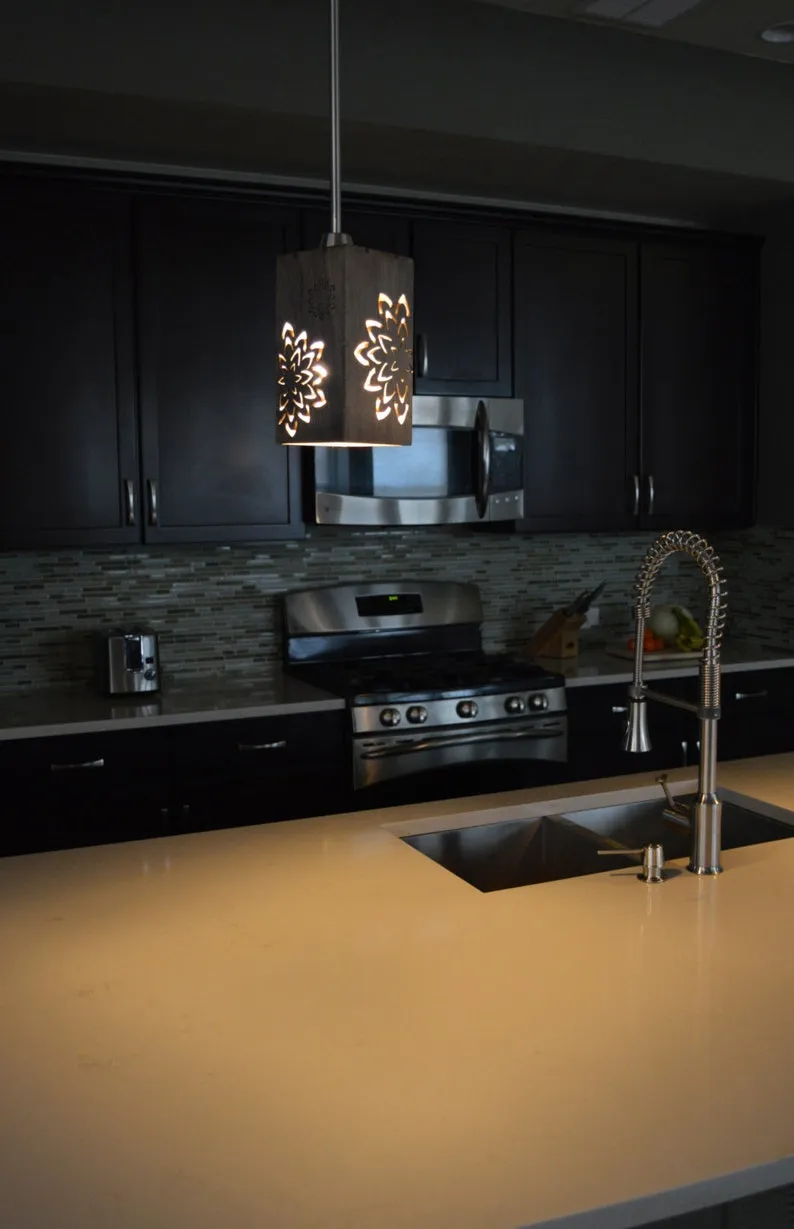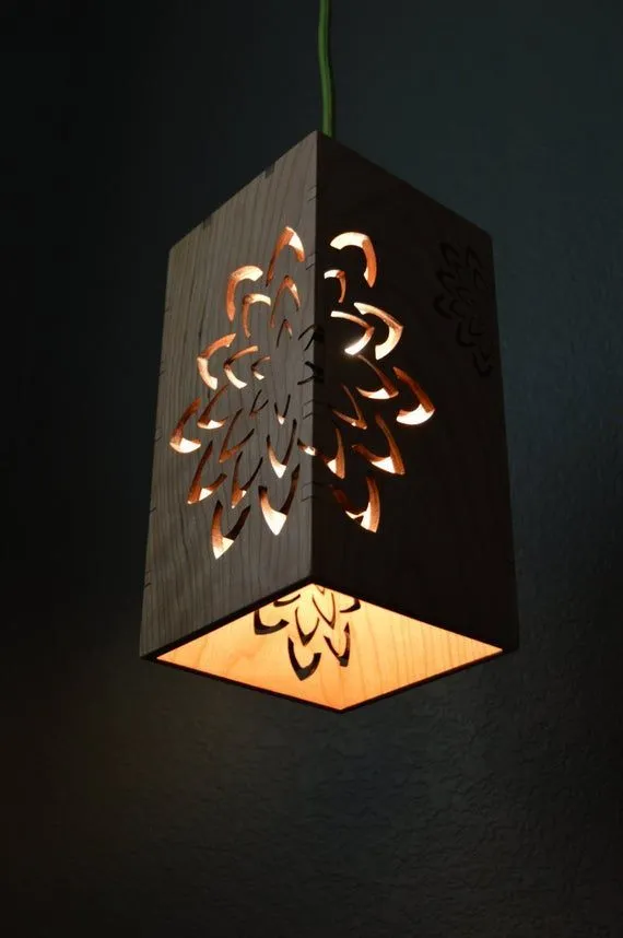 This wooden hanging lamp is perfect for any space and any age. The design has two large flower cut outs and the smaller flowers are etched into the wood. The lamp is made out of solid Cherry wood and is finished with a satin Polyurethane. The lamp measures 4.75″ x 4.75″ x 9″. The lamp is available with a 12′ fabric cord. The cord has a toggle switch and is a 3 prong cord which allows you to plug in the light or hard wire, if desired. The cord is available in black, white, black and white braid, green, blue and purple. Bulb is not included.